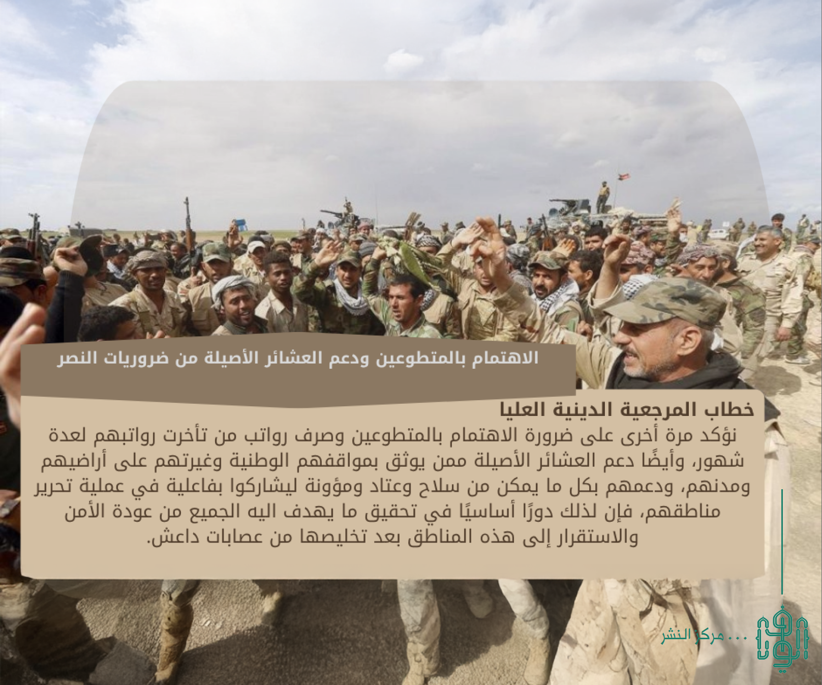 نؤكد مرة أخرى على ضرورة الاهتمام بالمتطوعين وصرف رواتب من تأخرت رواتبهم لعدة شهور، وأيضًا دعم العشائر الأصيلة ممن يوثق بمواقفهم الوطنية وغيرتهم على أراضيهم ومدنهم، ودعمهم بكل ما يمكن من سلاح وعتاد ومؤونة ليشاركوا بفاعلية في عملية تحرير مناطقهم، فإن لذلك دورًا أساسيًا في تحقيق ما يهدف اليه الجميع من عودة الأمن والاستقرار إلى هذه المناطق بعد تخليصها من عصابات داعش.