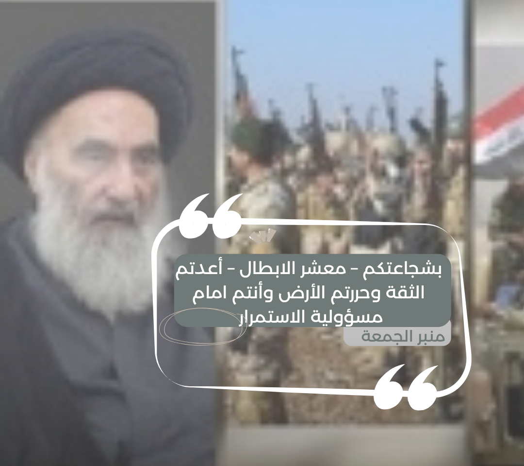 أنتم يا أبناءنا الأبطال في القوات المسلحة، أيها المتطوعون الغيارى ويا أبناء العشائر الكرام لقد أثبتم خلال الأشهر الماضية عظيم شجاعتكم وبأسكم وبطولتكم، وأعدتم الثقة بقدرات العراقيين حين تمكنتم خلال فترة زمنية قياسية من تحرير مدن ومناطق مهمة كجرف الصخر والعظيم وآمرلي وجبال حمرين والدور والعلم وتكريت، في وقت كان الكثيرون يعتقدون بصعوبة وطول المدة المطلوبة لتحريرها، وها أنتم اليوم أمام مسؤولية الاستمرار في منازلة الإرهابيين لتخليص البلد منهم نهائيًا، ونحن واثقون بأنكم أهلٌ لتحمل هذه المسؤولية وإن النصر حليفكم، وستتحرّر بقية مناطق العراق على أيديكم من رجس الدواعش وأتباعهم إن عاجلًا أو آجلًا.