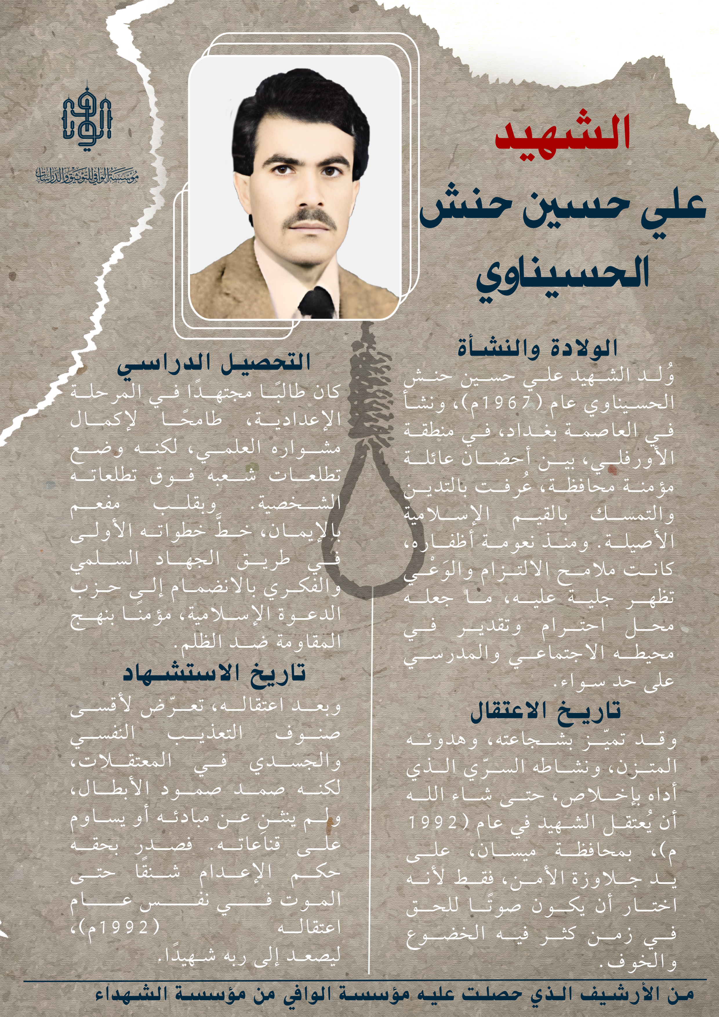 وبالرغم من صغر سنه، كان يتمتع بروح مسؤولة وناضجة، تسكنها الغيرة على الدين والوطن. وقد تميّز بشجاعته، وهدوئه المتزن، ونشاطه السرّي الذي أداه بإخلاص، حتى شاء الله أن يُعتقل الشهيد في عام (1992م)، بمحافظة ميسان، على يد جلاوزة الأمن، فقط لأنه اختار أن يكون صوتًا للحق في زمن كثر فيه الخضوع والخوف.