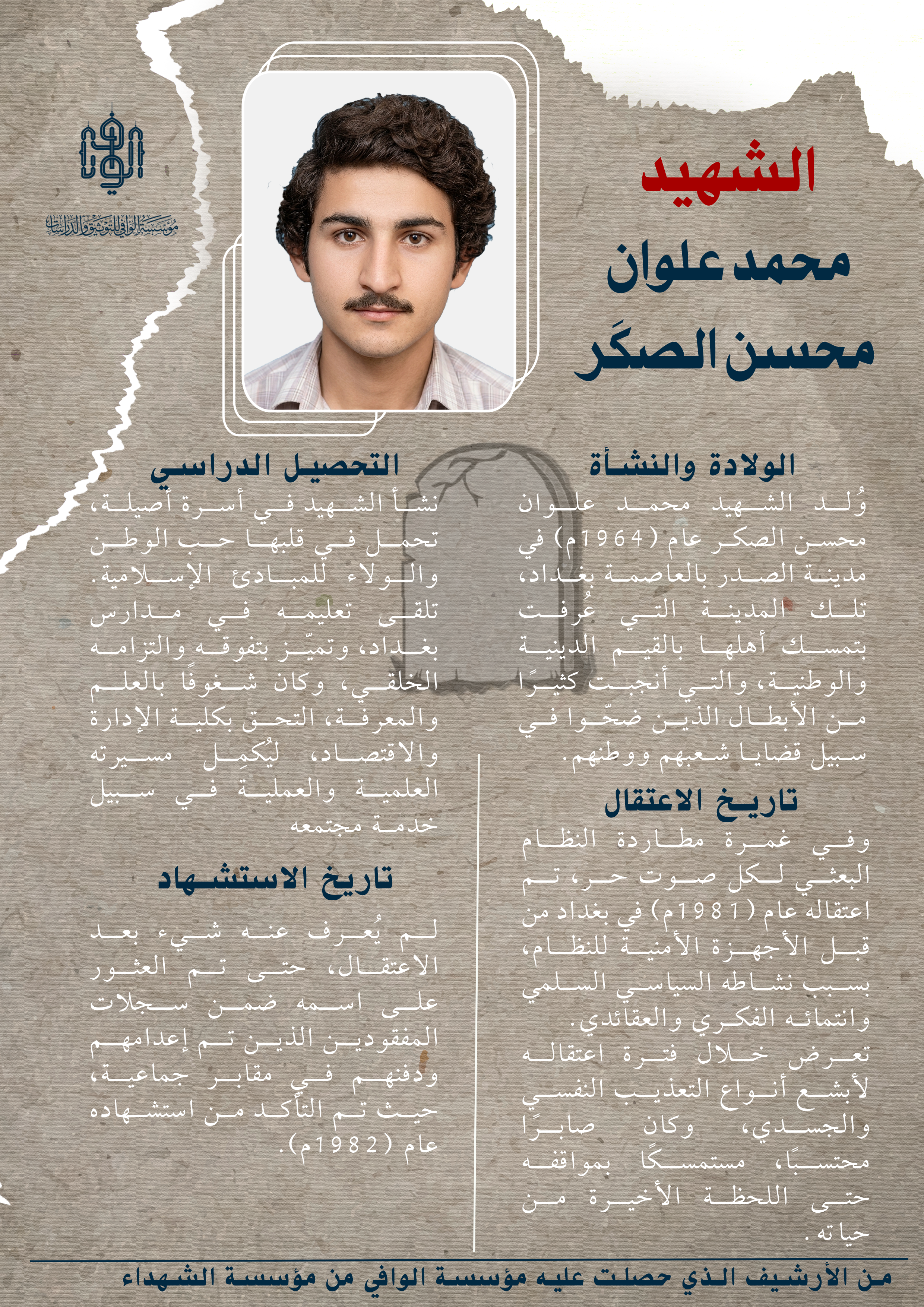 ولد الشهيد محمد علوان محسن الصكر عام (1964م) في مدينة الصدر بالعاصمة بغداد، تلك المدينة التي عُرفت بتمسك أهلها بالقيم الدينية والوطنية، والتي أنجبت كثيرًا من الأبطال الذين ضحّوا في سبيل قضايا شعبهم ووطنهم.نشأ