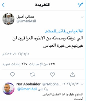 فكان العباس (عليه السلام) عنوان المجاهدين وقائدهم ورمزهم بالوفاء والغيرة من اجل التفاخر ببطولات الحشد وقائدهم العباس أطلق الناشطون العراقيون هذه الهاشتاكات فقد صول عدد التغريدات التي نشر على منصة السوشيل ميدا (65) ألف تغريدة.