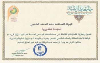 وقد أهدت جامعة أهل البيت (عليهم السلام) العديد من كتب الشكر إلى الجهات الساندة لحملة الحشد الجامعي في جامعة أهل البيت (عليهم السلام) لدعم قواتنا الأمنية والحشد الشعبي منها فرقة أنصار الحسين (عليه السلام) القتالية والهيئة المستقلة لدعم الحشد الشعبي.