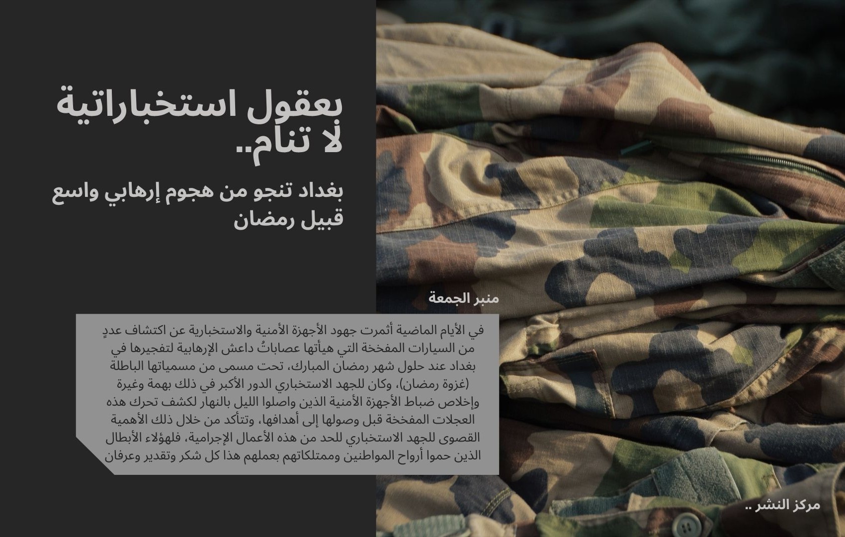في الأيام الماضية أثمرت جهود الأجهزة الأمنية والاستخبارية عن اكتشاف عددٍ من السيارات المفخخة التي هيأتها عصاباتُ داعش الإرهابية لتفجيرها في بغداد عند حلول شهر رمضان المبارك، تحت مسمى من مسمياتها الباطلة (غزوة رمضان)، وكان للجهد الاستخباري الدور الأكبر في ذلك بهمة وغيرة وإخلاص ضباط الأجهزة الأمنية الذين واصلوا الليل بالنهار لكشف تحرك هذه العجلات المفخخة قبل وصولها إلى أهدافها، وتتأكد من خلال ذلك الأهمية القصوى للجهد الاستخباري للحد من هذه الأعمال الإجرامية، فلهؤلاء الأبطال الذين حموا أرواح المواطنين وممتلكاتهم بعملهم هذا كل شكر وتقدير وعرفان، وقد أوضح عدد من المسؤولين الأمنيين مدى الحاجة الضرورية لتزويد الأجهزة الاستخبارية معدات تقنية حديثة تسهل كثيراً كشف تحركات الإرهابيين في تفخيخ السيارات ونقلها، مع أن أثمان تلك المعدات ليست بالكبيرة ويمكن توفيرها بتخفيض ما خصص لأمور ليست بالضرورية كمخصصات الضيافة والايفاد والتأثيث ونحوها في بعض الدوائر.