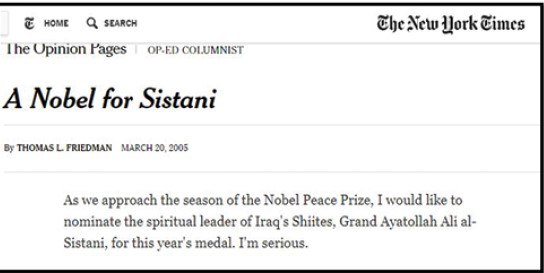 نشر موقع صحيفة (The New York Times) بتاريخ 20 / مارس / 2005م مقالا بعنوان (نوبل للسيستاني).