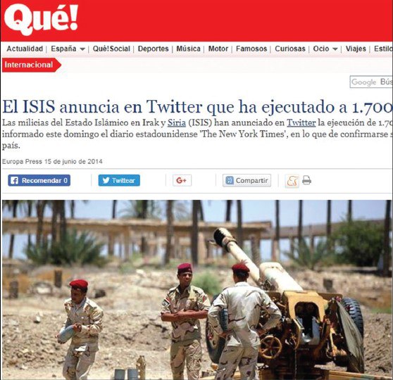 نشر موقع que.esبتاريخ 2014615 خبراً بعنوان داعش الذي أعدم 1700 جندي عراقي الذين ضحوا بأنفسهم لحماية البلد وشعبه من براثن الإرهاب، ليس هنا فقط بل كل ما يذكر من حديث بحق الذين وقفوا ضد المجموعات الإرهابية لم يعد كافيًا من وصف، وجاء هذا بعد نداء المرجعية الدينية العليا للدفاع عن الوطن والحفاظ على وحدته.