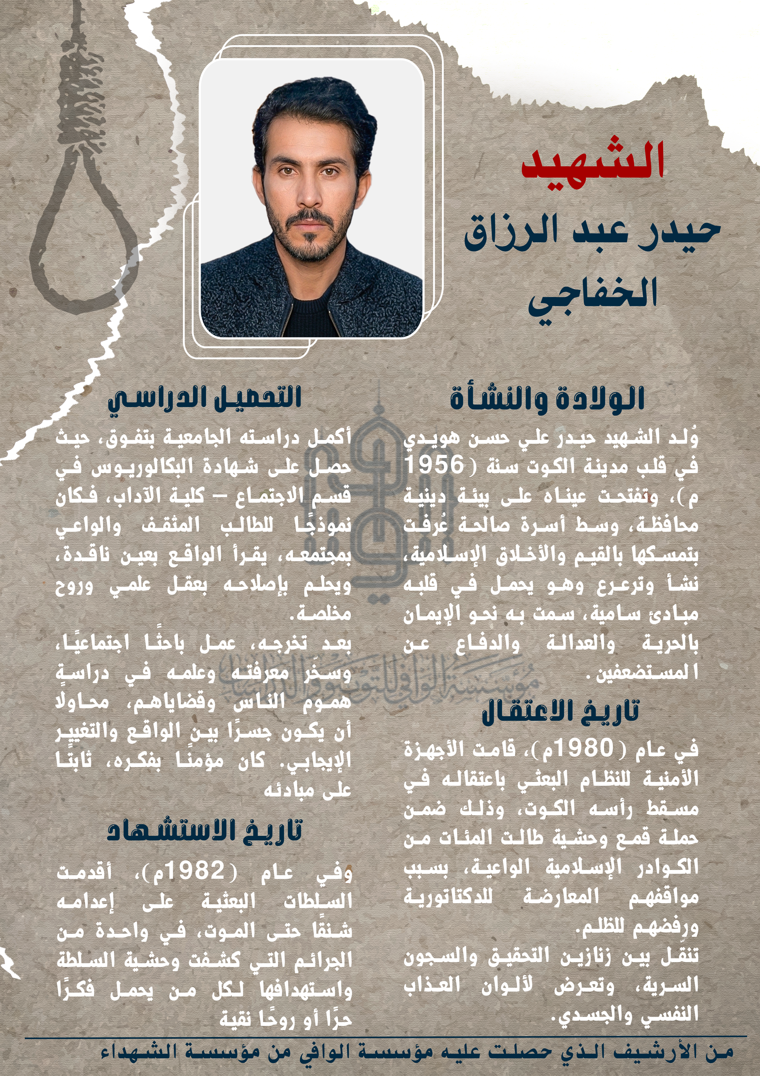 وفي عام (1982م)، أقدمت السلطات البعثية على إعدامه شنقًا حتى الموت، في واحدة من الجرائم التي كشفت وحشية السلطة واستهدافها لكل من يحمل فكرًا حرًا أو روحًا نقية.
