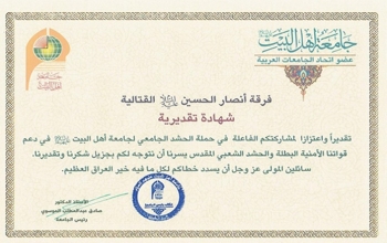 وقد أهدت جامعة أهل البيت (عليهم السلام) العديد من كتب الشكر إلى الجهات الساندة لحملة الحشد الجامعي في جامعة أهل البيت (عليهم السلام) لدعم قواتنا الأمنية والحشد الشعبي منها فرقة أنصار الحسين (عليه السلام) القتالية والهيئة المستقلة لدعم الحشد الشعبي.