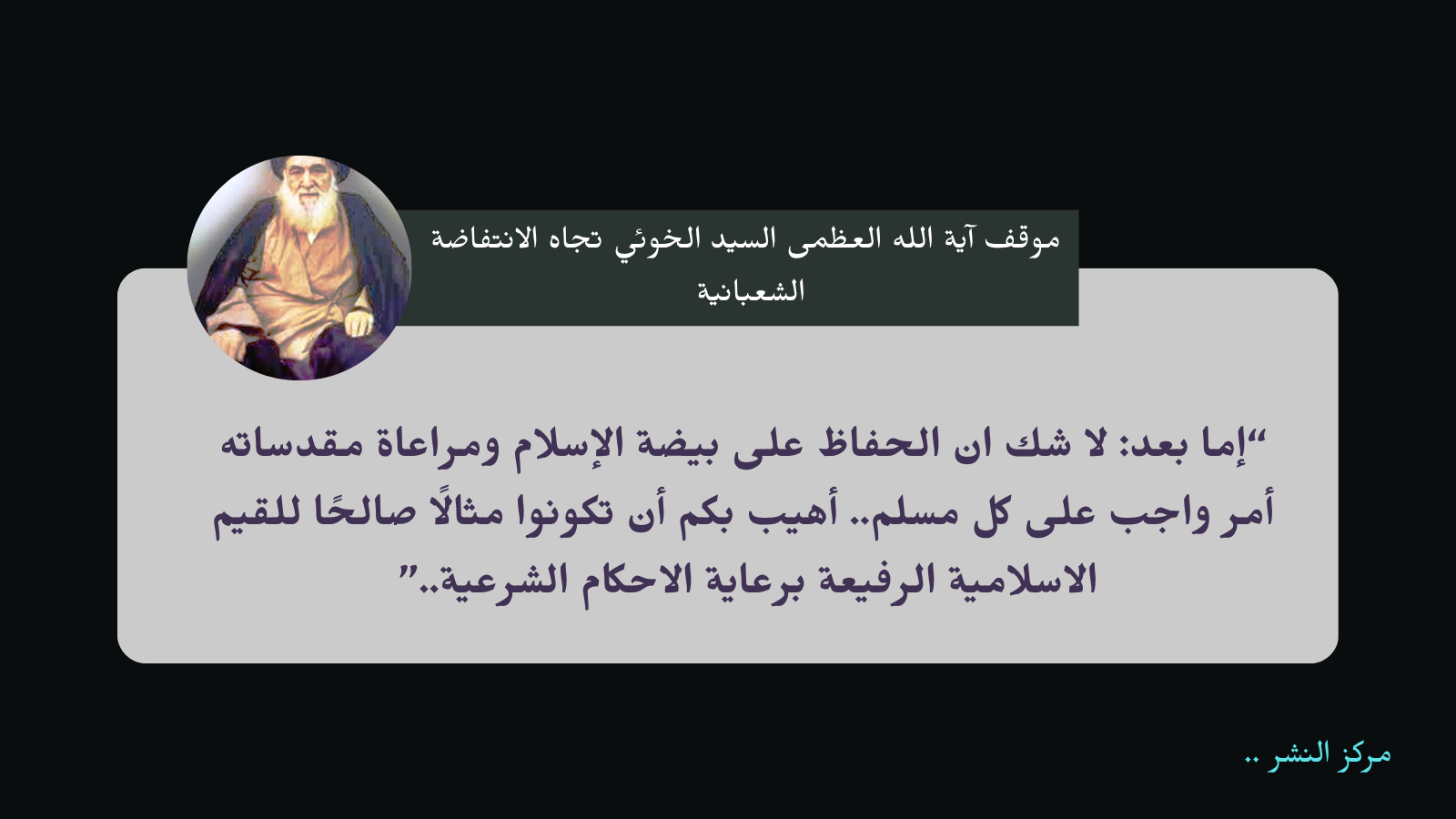 بعبارات محسوبة ودقيقاً في صياغته ومكتفيًا بالإشارة الى حث الناس على ضرورة تمسكهم بتعاليم الإسلام ومبادئه، والتقيد بالأحكام الشرعية، وخوفه على أرواح الناس من إراقة دمائهم الشريفة على إيدي أزلام النظام البائد وطيش وبطش الحاكم المجرم صدام حسين، فكان تدخل السيد الخوئي ينم عن حكمة عظيمة وحرص شديد على نفوس وممتلكات الناس فجاء في بيانه : "وبعد: لا شك ان الحفاظ على بيضة الإسلام ومراعاة مقدساته امراً واجب على كل مسلم... أهيب بكم أن تكونوا مثالًا صالحًا للقيم الإسلامية الرفيعة برعاية الأحكام الشرعية، رعاية دقيقة في كل أعمالكم وتصرفاتكم، وجعل الله تبارك وتعالى نصب أعينكم في كل ما يصدر منكم، فعليكم الحفاظ على ممتلكات الناس وأموالهم وأعراضهم، وكذلك جميع المؤسسات العامة لأنها ملك الجميع والحرمان منها حرمان الجميع".
