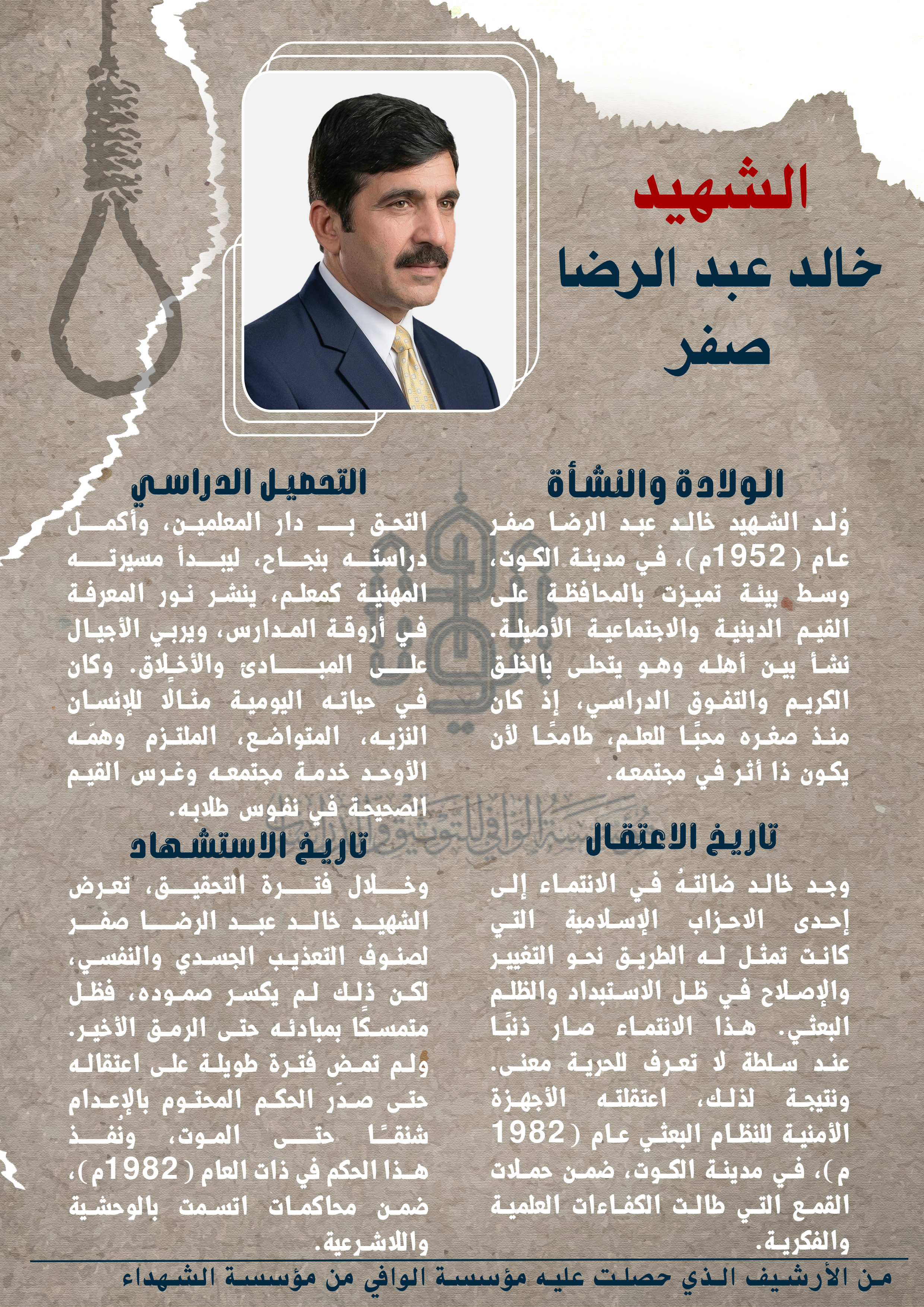 وخلال فترة التحقيق، تعرض الشهيد خالد عبد الرضا صفر لصنوف التعذيب الجسدي والنفسي، لكن ذلك لم يكسر صموده، فظل متمسكًا بمبادئه حتى الرمق الأخير. ولم تمضِ فترة طويلة على اعتقاله حتى صدر الحكم المحتوم بالإعدام شنقًا حتى الموت، ونُفذ هذا الحكم في ذات العام (1982م)، ضمن محاكمات اتسمت بالوحشية واللاشرعية.