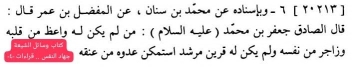 روي عن الإمام الصادق "عليه السلام": ((مَنْ لَمْ يَكُنْ لَهُ وَاعِظٌ مِنْ قَلْبِهِ، وَزَاجِرٌ مِنْ نَفِسِهِ، وَلَمْ يَكُنْ لَهُ قَرِيْنٌ مُرْشِدٌ، اسْتَمْكَنَ عَدُوُّهُ مِنْ عُنُقِهِ)). (وسائل الشيعة، الحر العاملي، ج١٥ ص١٦٢، كتاب (الجهاد)، أبواب (جهاد النفس وما يناسبه) الحديث ٦.